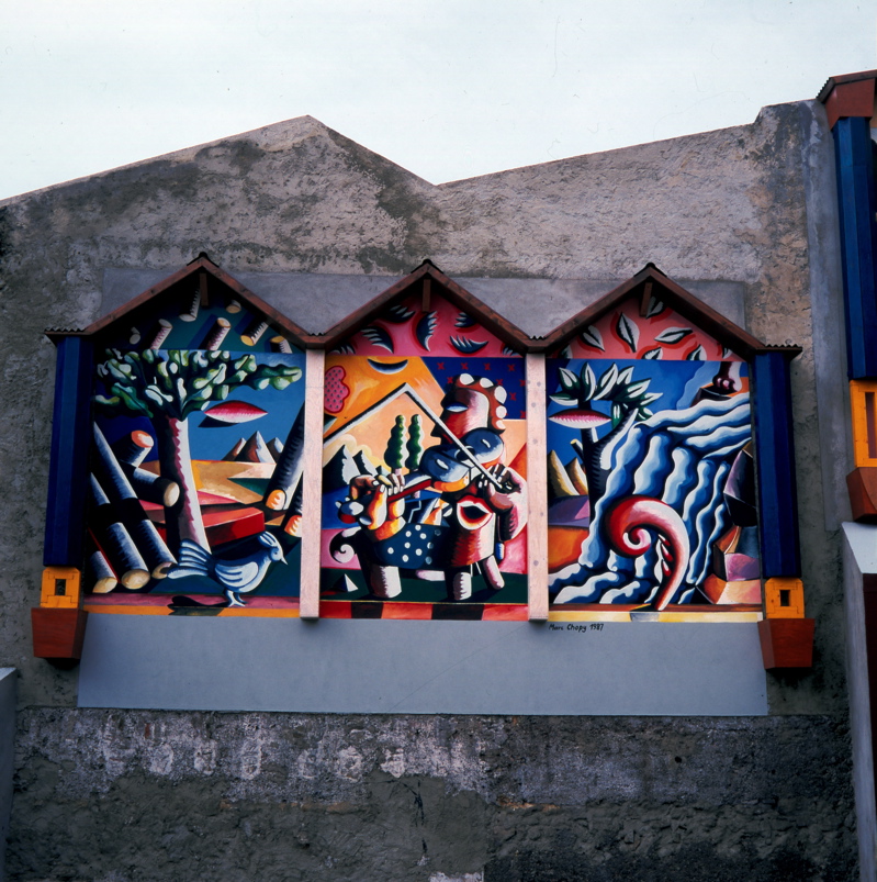Mur peint et construction bois, acrylique sur enduit.