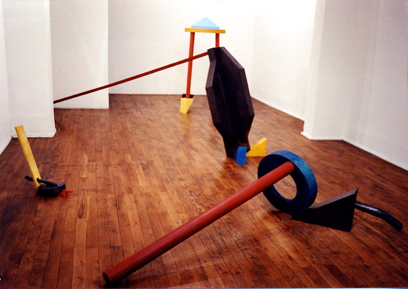 sculpture n° 3. "Plaque jaune retenue par la masse d'un cylindre en plomb et basculés" 1992.
