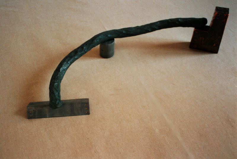 Pièce au solvert de gris sur trois basculeurs. résine colorée sur bois, métal, cuivre, zinc.