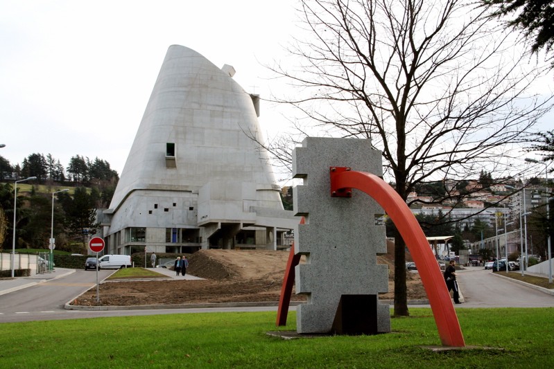 L'arc rouge qui retient cette pierre fait signe, clinquant, très visuel du même rouge que la signalétique routière. Il est là pour dévier toute la gravité et la fragilité de la pierre inclinée. L'arc est aussi la référence à cette mémoire culturelle du site industriel, métallurgique que représente la ville de Firminy. Cet arc forme un cercle virtuel dont une grande partie serait enterrée, comme pour générer un mouvement transperçant la pierre. Il nous donne aussi l'orientation est/ouest en direction de l'orient de l'Eglise de le Corbusier. C'est comme une réponse à ce lieu ou une tension vers ce lieu.