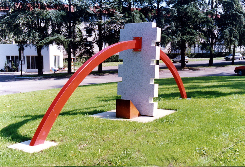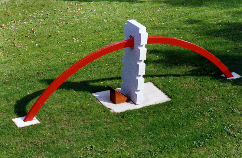 J'ai choisi la pierre. Un monolithe en granit blanc d'Espagne de deux tonnes, en prenant le parti de le "basculer" par une cale et de le retenir dans un même temps par un arc an acier peint. Jeu d'opposition dynamique.
