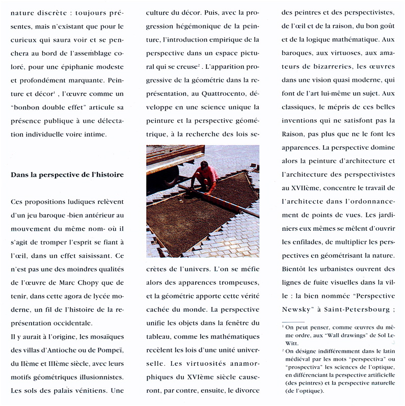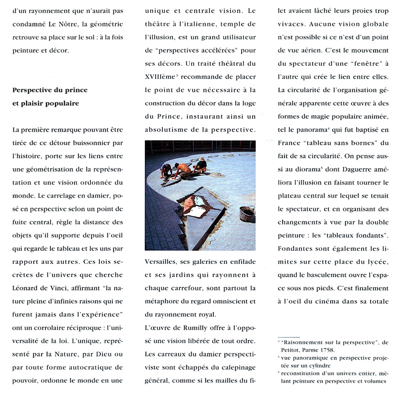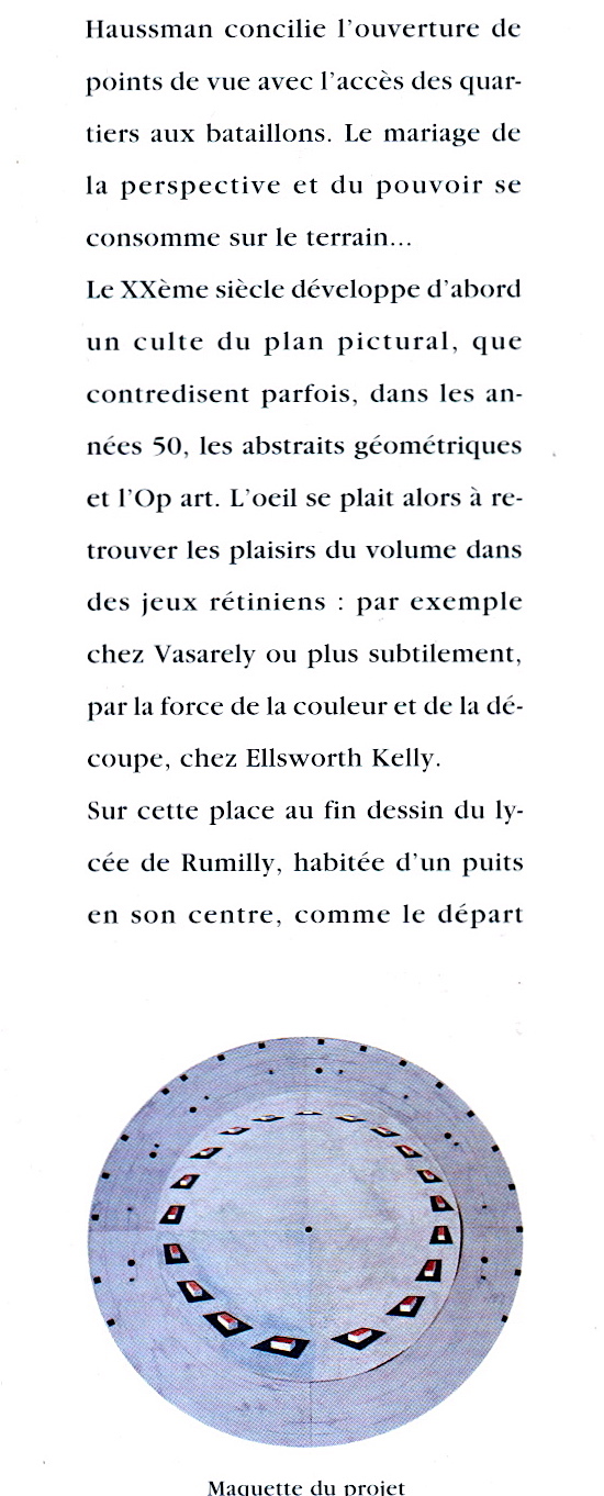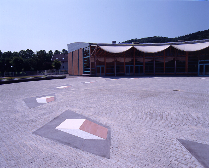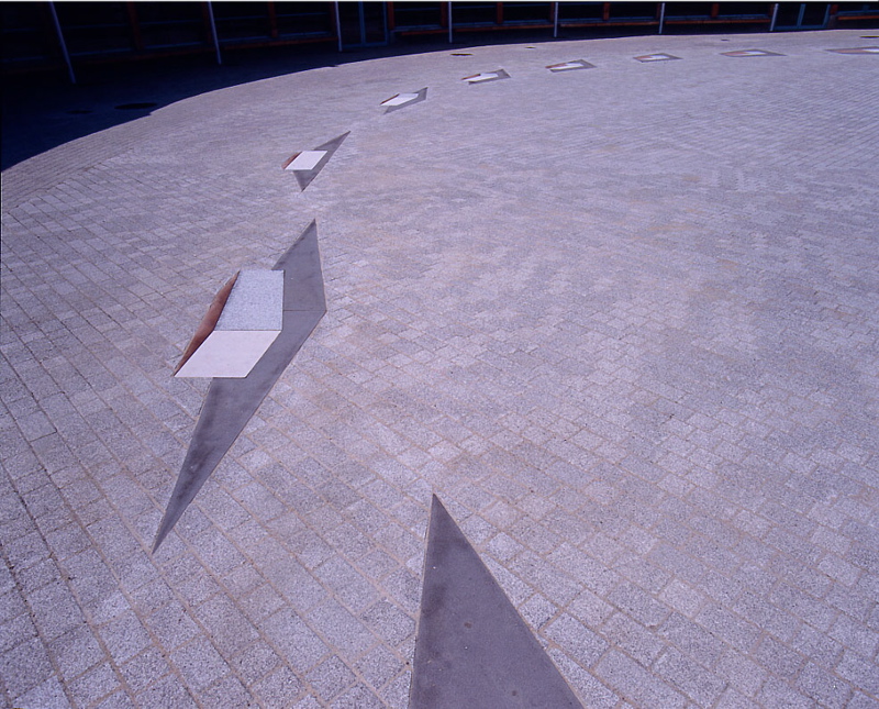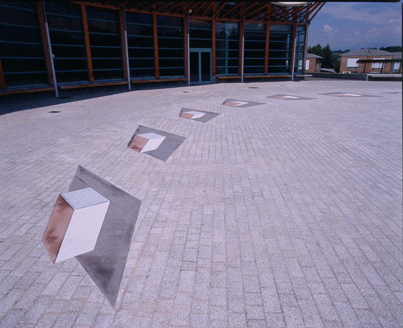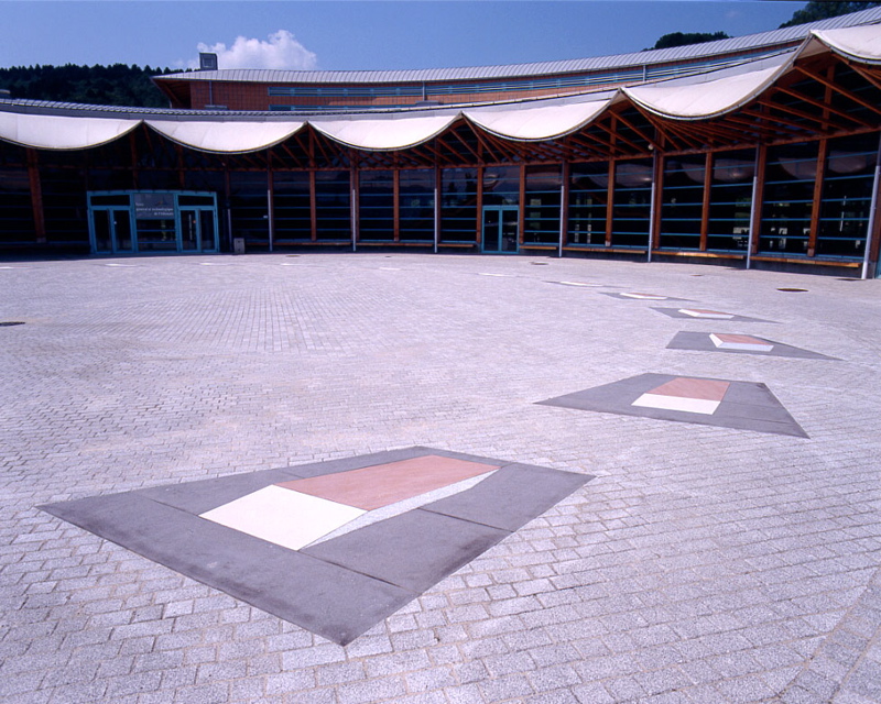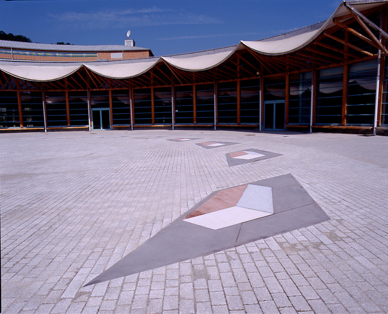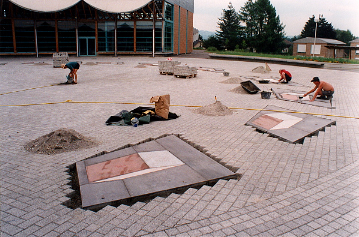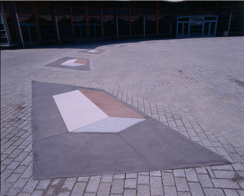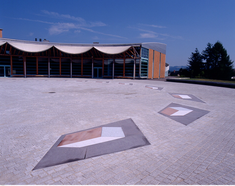 Marquetterie de pierres : Lave de Bouzentès, Grès d'Alsace, Calcaire de Chandoré, granit du Tarn, pièce in-situ, dans un cercle de 40 mètres