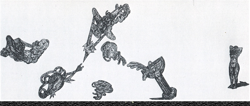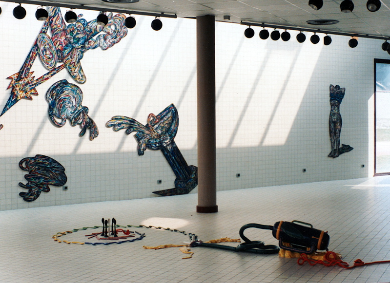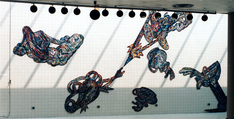Pastel gras sur papier marouflé sur film plastique, collé sur contreplaqué mis en forme. En sept éléments. Dragon-rasoir, Saint-Georges-aviateur, chapeau-nuage, pot et son ombre, lavabo-eau, princesse au loin. N°1: 98,5 x 211x 0,9 cm; n°2: 105,5 x 229 x 0,9 cm; n° 3 : 163 x 310 x 0,9 cm; n° 4: 128 x 78 x 0,9 cm; n° 5: 88 x 94 x 0,9 cm; n° 6: 227,5 x 147 x 0,9 cm; n° 7: 177,5 x 92,7 x 0,9cm.