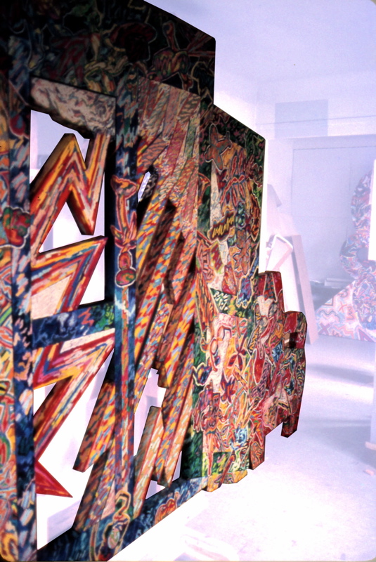 L'une des ces pièces découpée comme un dentelle et construite en plusieurs éléments assemblés et boulonnées et intitulée "L'art assassiné par l'amour" est propriété de la collection du Fond National d'Art Contemporain, cette oeuvre réalisé dans le petit atelier qui était le mien alors, sera exposée aux Halles l'Ile à Genève puis partira directement à Paris sans reproduction photographique digne de ce nom, seule me reste les images prises dans la pièce étroite de mon atelier des images morcelées, tant le recul faisait défaut pour photographier l'ensemble de la pièce.