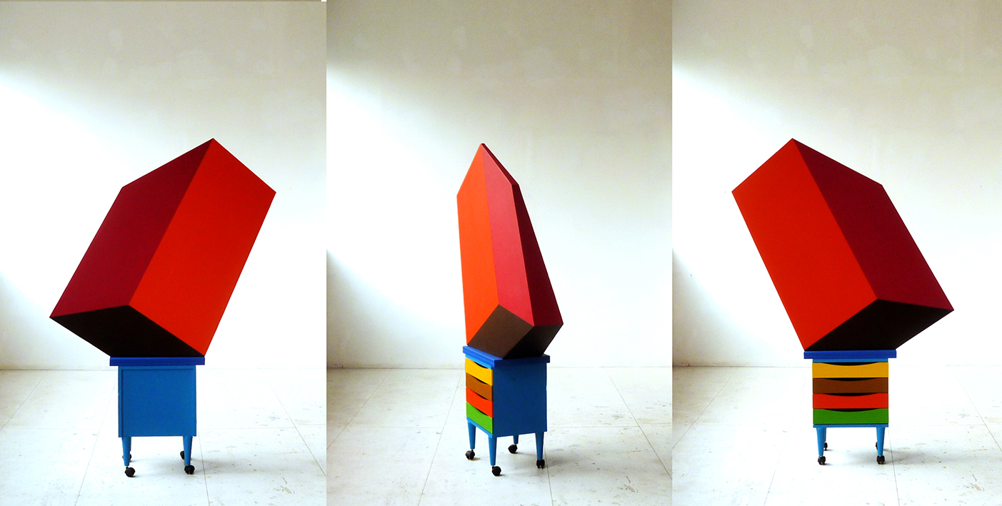 Basculeur 422, 2008, acrylique sur médium et toile , meuble, roulettes ; 166 x 112 x 30 cm.