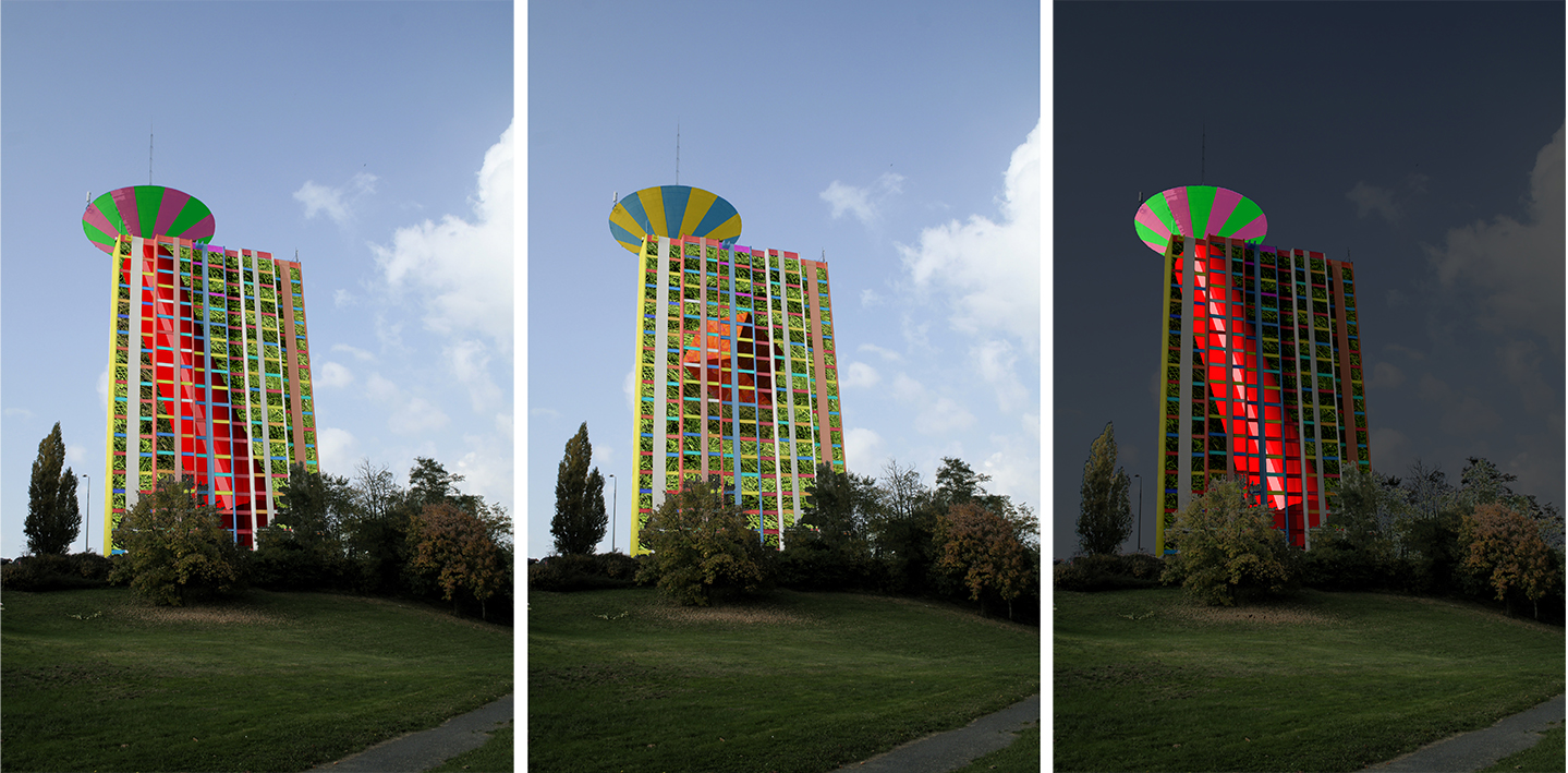 Projet de conversion de la Tour Plein Ciel à Saint-Etienne, quartier de Montreynaud en "Sulpture Utopique", commande de la ville de Saint-Etienne, mai 2009 octobre 2010, tirage photos et animation vidéo.