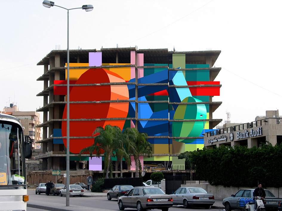 Projet pour un bâtiment inachevé, rue Khalil Mountran à Beyrouth, 2006, impression numérique sur bâche plastique ; 300 x 400 cm.